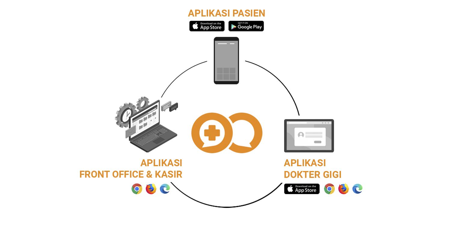 KLINIKOO LITE terdiri atas tiga aplikasi yang terintegrasi: aplikasi dokter, aplikasi front office & kasir, dan aplikasi pasien.